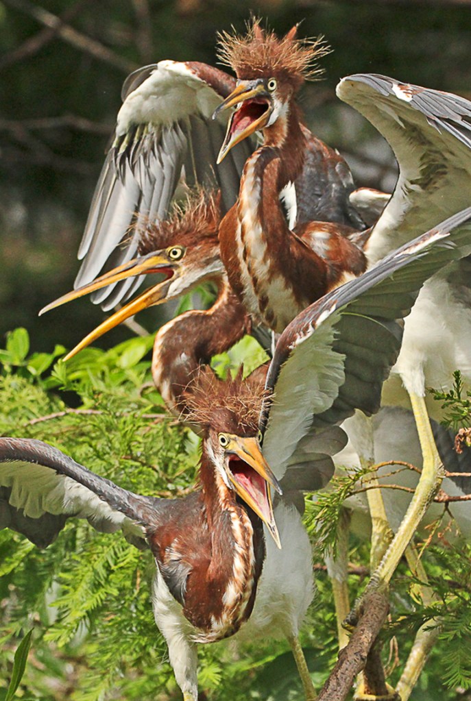 A trio of juvenile tricolored herons ravenously awaits the return of their parents and some healthy meals of regurgitated fish. (Photo credit: Copyright Budd Titlow/NATUREGRAPHS)