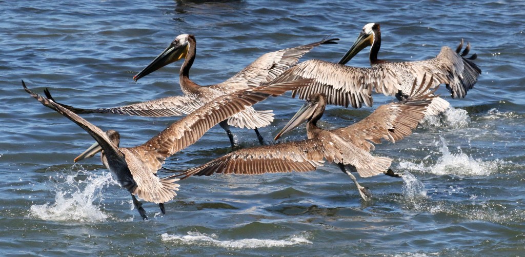 One of Nature’s most proficient birds at skimming just above the water surface, this brown pelican quartet prepares to feed in tandem.