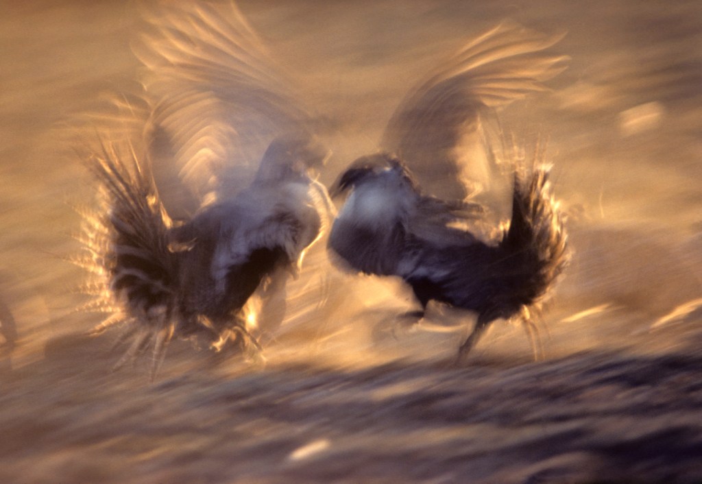 Male sage grouse embroiled in a territorial battle on a lek—mating ground—located in northwestern Colorado. (Photo Copyright Budd Titlow, NATUREGRAPHS)