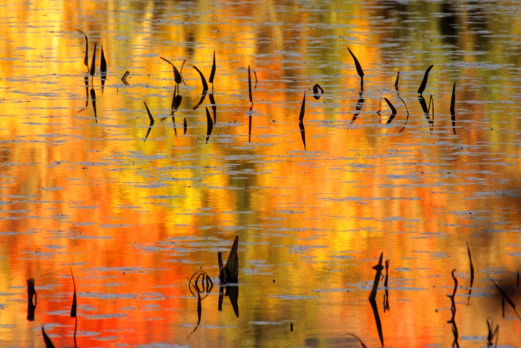 Reflections of fall foliage embolden a lake in New Hampshire’s White Mountains. (Photo Copyright Budd Titlow, NATUREGRAPHS)